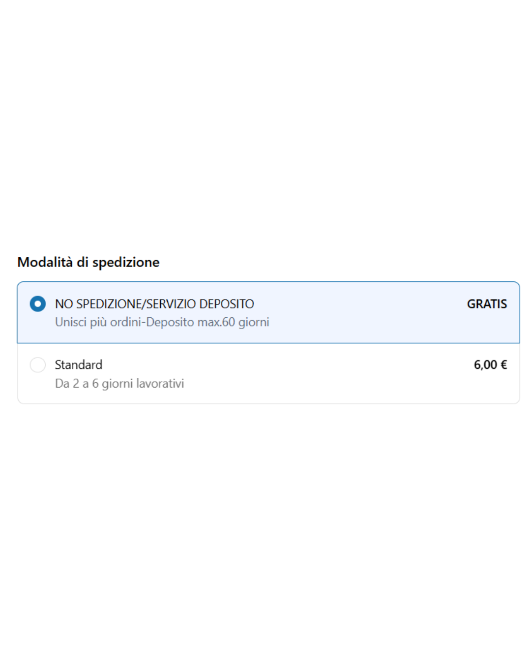 Al momento del check-out, scegliete l’opzione 'NO SPEDIZIONE/SERVIZIO DEPOSITO': avrete così 60 giorni di tempo per aggiungere altri acquisti e riceverli tutti insieme con un’unica spedizione.